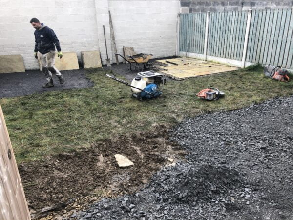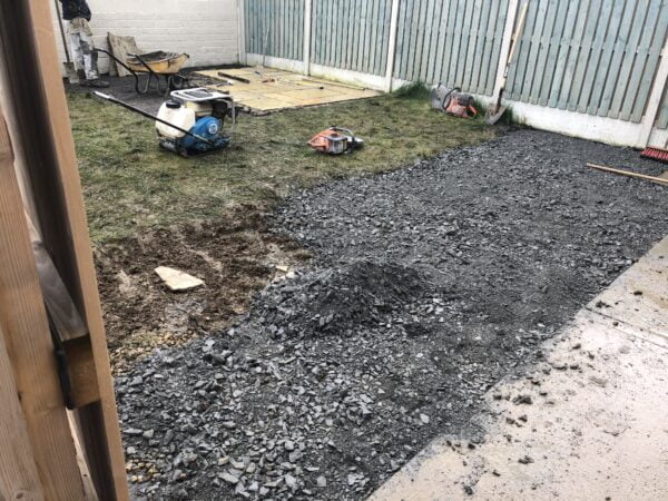 Dug out and removed the area, Graded off the surface, Repaired any damaged areas, Redesigned the layout of the area, Raised base levels in the area, Supplied and installed 804 stone base, New step(s)Slabbing Installation