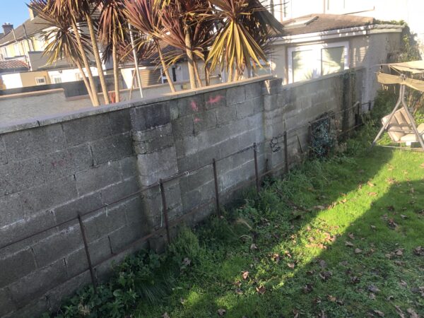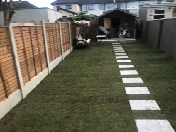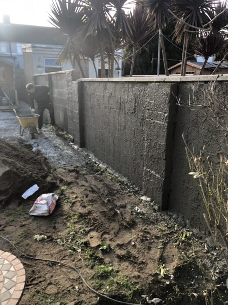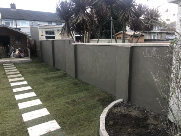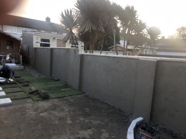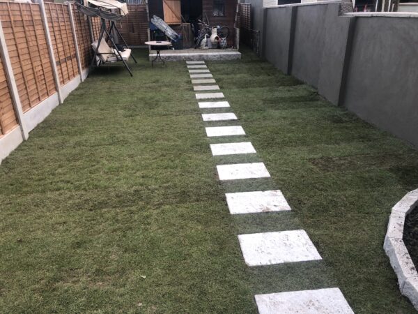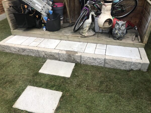 Bricklaying Work → Concrete Block Walls, Patio Slabbing → Concrete Slabbing, Natrual grey rock face solid 4 inch, Patio Slabbing, Lawns → Roll on Turf, Step up patio, Wooden Fencing