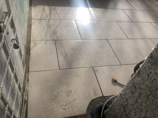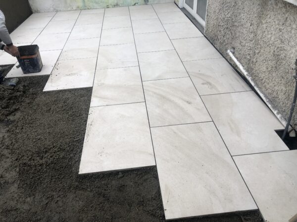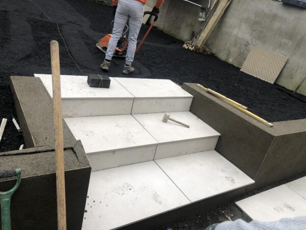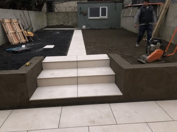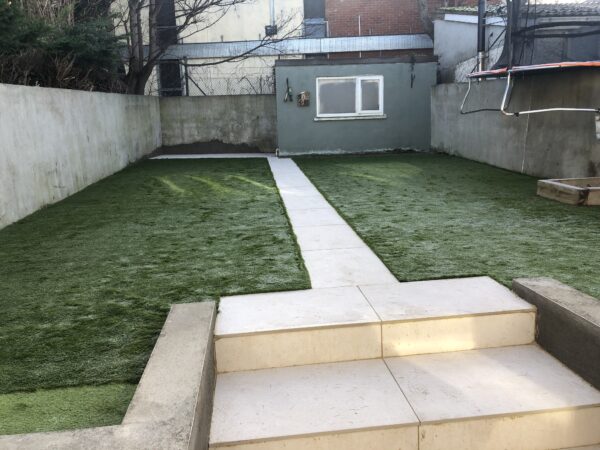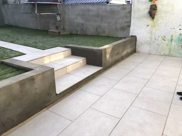 Lawns → Artificial Grass, Bricklaying Work → Brick Walling, Lawns, Patio Slabbing → Porcelain Tiling, Solas silver, Step up patio, Wooden Fencing