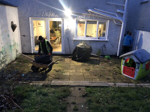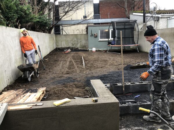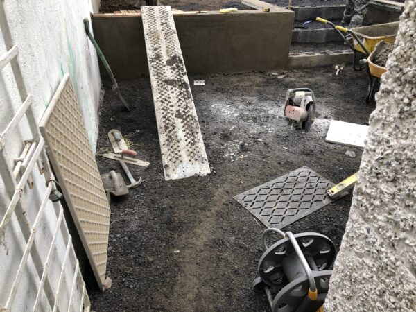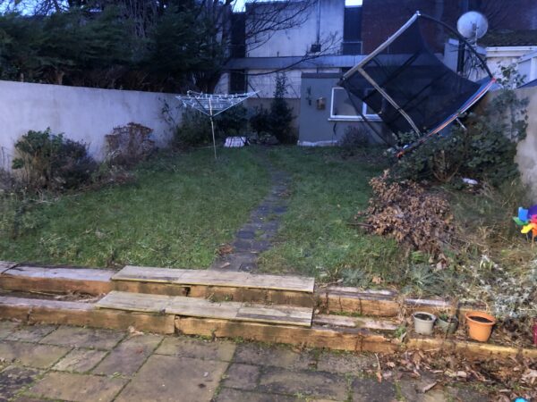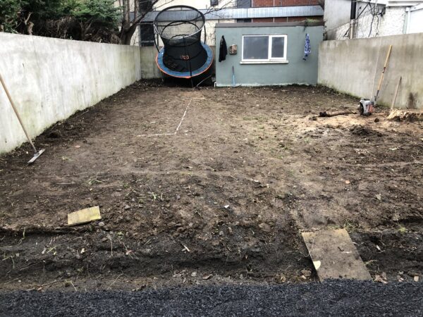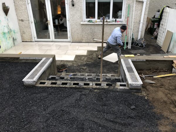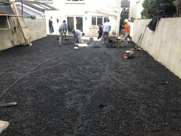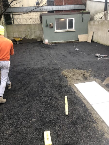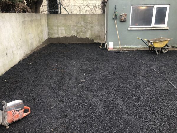 Dug out and removed the area, Graded off the surface, Cut out damaged areas, Repaired any damaged areas, Chipped out the perimeter of the area, Redesigned the layout of the area, New drainage system, Aco channel drains installed, New underground piping, Raised base levels in the area, Adjusted the overall levels of the area, Supplied and installed 804 stone base, Supplied and installed MOT Type 1 foundation, Supplied and installed membrane sheeting, New step(s), New wooden fencing, Supplied and installed wooden sleepersSlabbing Installation